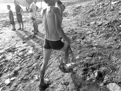 8月10日下午5时,记者来到吟州村。如邵先生所说,港儿河东片区的河水已经被抽得能看见河床,最深处也只能及腰。综观整个东片区,约有数十人在水中捞鱼。不一会儿,就听见中心区域一阵欢呼,原来是一男子徒手捉了一条约20多斤的大鱼出来。