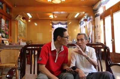 陈春辉老人向记者介绍当年峥嵘的革命岁月。