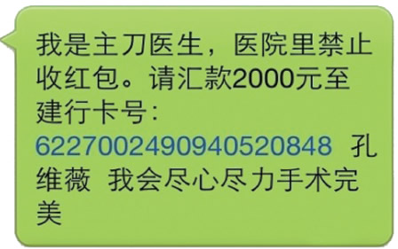 “我是主刀医生,医院里禁止收红包。请汇款2000元至建行卡号:6227002490940520848孔维薇我会尽心尽力手术完美。”昨日下午,入住温医附一院新院区的病患家属刘先生(化名)收到了这样一条短信,距他父亲住院还不到5小时。