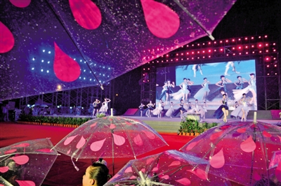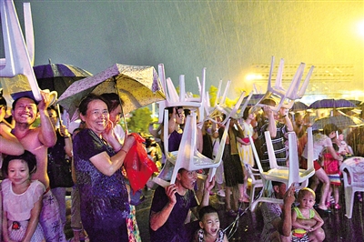 昨日,温州第六届排舞大赛在温州大剧院广场举行,来自11个县(市、区)的24支队伍同台竞技。一场暴雨不期而至,于是——舞台上,舞者“千姿百态”(上图),舞台下,观者“百态千姿”(下图)。