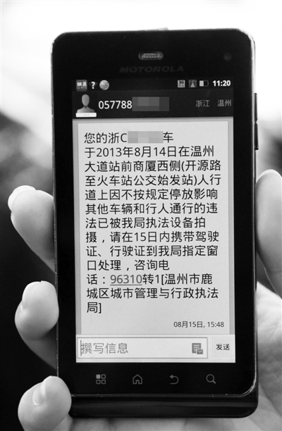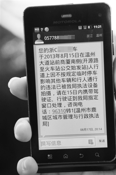 次日,黄女士收到了第一条提醒短信,车子因为违停被抄告,但由于人在外地,公务在身,备用钥匙也没有在温州,一时无法回来挪车,车子也确实存在违章行为,对于这次处罚她愿意接受。但让她意外的是,接下去的几天时间内,手机短信不断地提醒,车子由于违停被抄牌,前后收到5次短信。“车子有违停行为,这我认罚,但我无法回来挪车,城管继续处罚我,我认为这不合理。”那些天,黄女士看着一条条处罚提醒干着急,这成了出差时心中的煎熬。