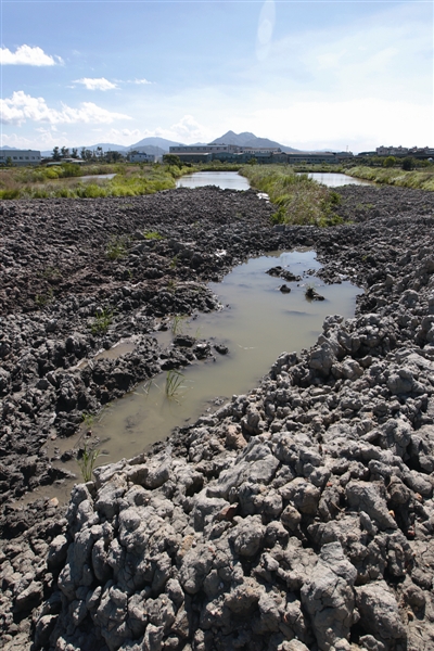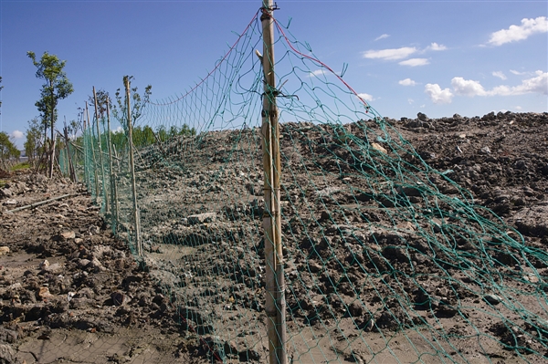 据目测,该处渣土堆长约280米、宽约70米、高约1.5米,形成了一道“长堤”。由于连日高温,表面渣土已被晒开裂,但仍可以发现渣土堆中夹杂有较大水泥块、建筑废弃物等,渣土外围已被网栏围起,禁止行人和车辆进入。鱼塘东侧靠近飞云江堤塘处的几排绿化树,大部分也被推倒或者掩埋。