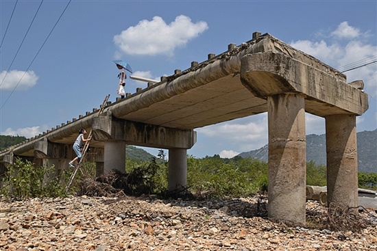 昨天下午1时许,记者在现场发现,断裂桥面拆除后,桥中间出现10米长的缺口,缺口处的桥面距离裸露的河床四五米高,一张竹梯靠在桥的一侧,一端用绳子和钢丝绑在桥面上,短短半个小时,有十多名村民从梯子爬下,在裸露的河床上步行到对岸。村民陈老伯说,这样下桥确实有危险,但绕道到对岸,原本200多米的路程至少要走7公里,实在太远了。