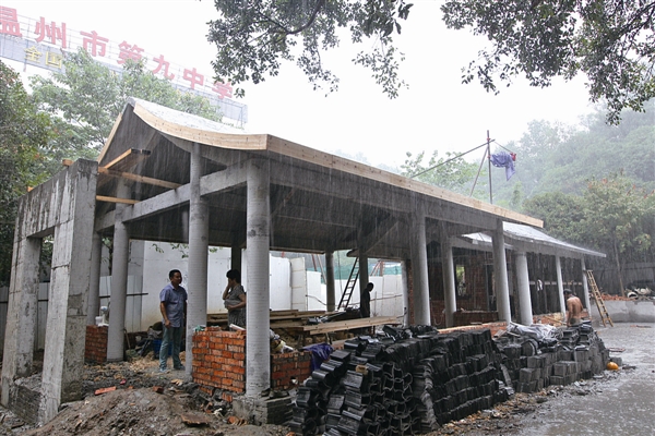 温州市区环城东路新红日亭工地,几名工人正在加紧施工。据悉,新红日亭于5月下旬进场施工,本月初结顶,目前已进入内部装修阶段,预计10月底可完工。新红日亭特别设置了厨房。以前爱心老人们熬粥和煮伏茶要在别处先做好再送来,新亭子完工后,就可在亭子内直接完成。