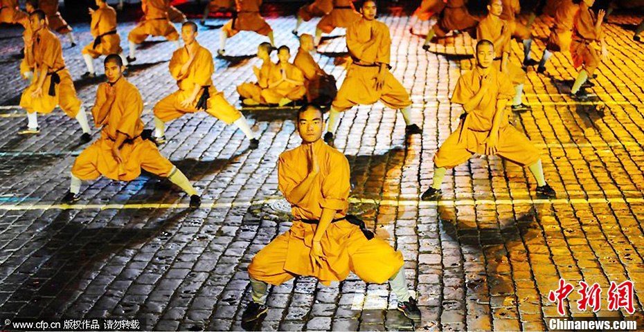 当地时间9月1日,2013年“斯帕斯卡亚塔楼”国际军乐节在莫斯科红场拉开帷幕。军乐节于9月1日至9月8日举行。图为少林武僧在军乐节上进行表演。图片来源:CFP视觉中国