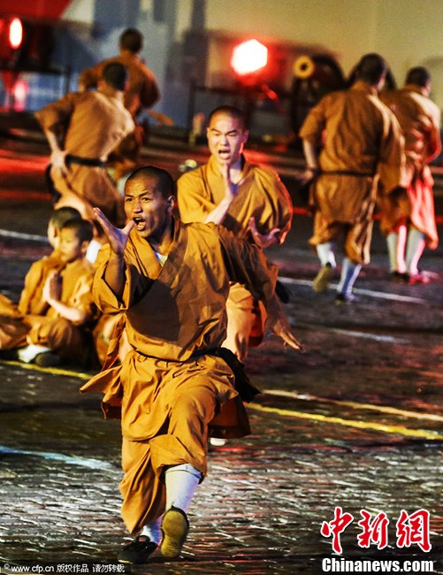 当地时间9月1日,2013年“斯帕斯卡亚塔楼”国际军乐节在莫斯科红场拉开帷幕。军乐节于9月1日至9月8日举行。图为少林武僧在军乐节上进行表演。图片来源:CFP视觉中国