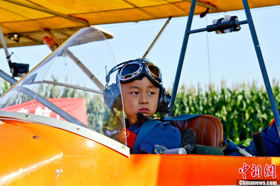 8月31日,河北固安,5岁“裸跑弟”成功驾驶一固定翼飞机,飞越15公里外的北京野生动物园上空。这是一次长达35分钟的飞行。图为“裸跑弟”准备起飞。秦怀珠摄图片来源:东方IC版权作品请勿转载
