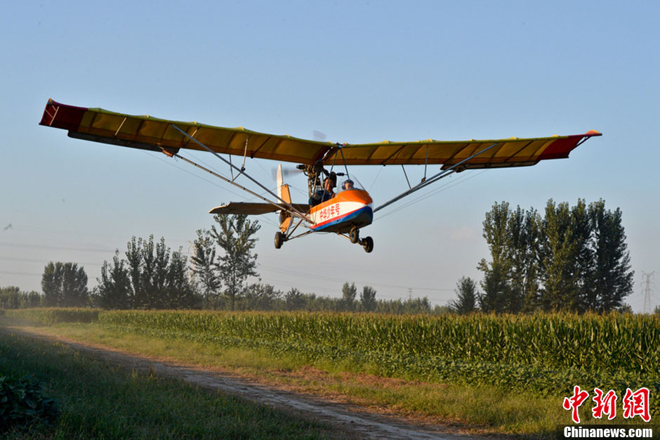 8月31日,河北固安,5岁“裸跑弟”成功驾驶一固定翼飞机,飞越15公里外的北京野生动物园上空。这是一次长达35分钟的飞行。图为“裸跑弟”起飞。秦怀珠摄图片来源:东方IC版权作品请勿转载