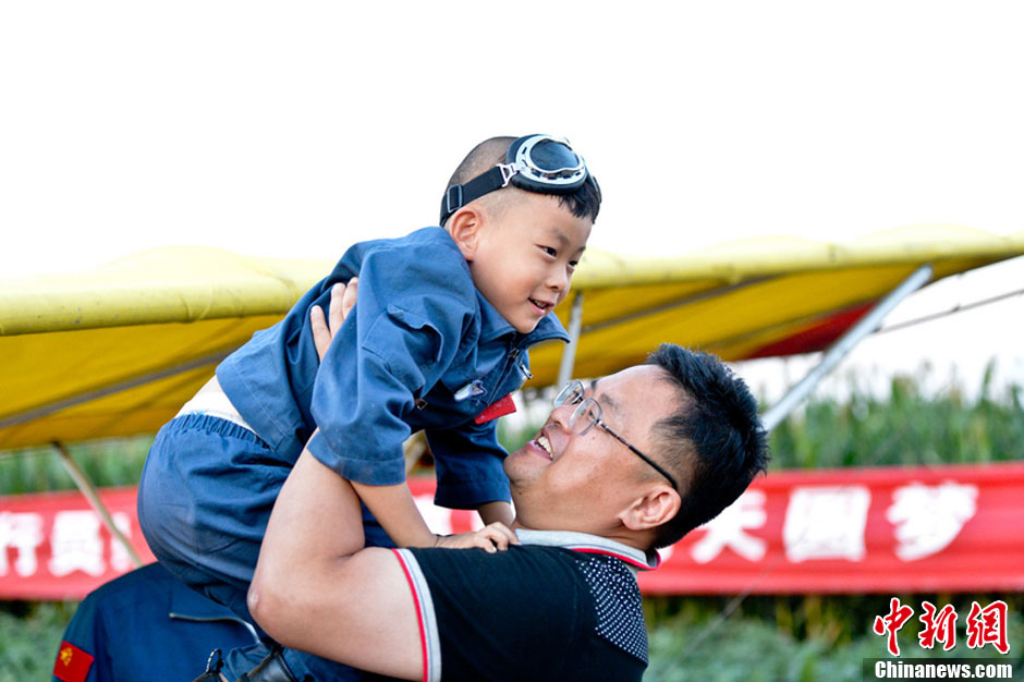 8月31日,河北固安,5岁“裸跑弟”成功驾驶一固定翼飞机,飞越15公里外的北京野生动物园上空。这是一次长达35分钟的飞行。图为“裸跑弟”和他的父亲。秦怀珠摄图片来源:东方IC版权作品请勿转载