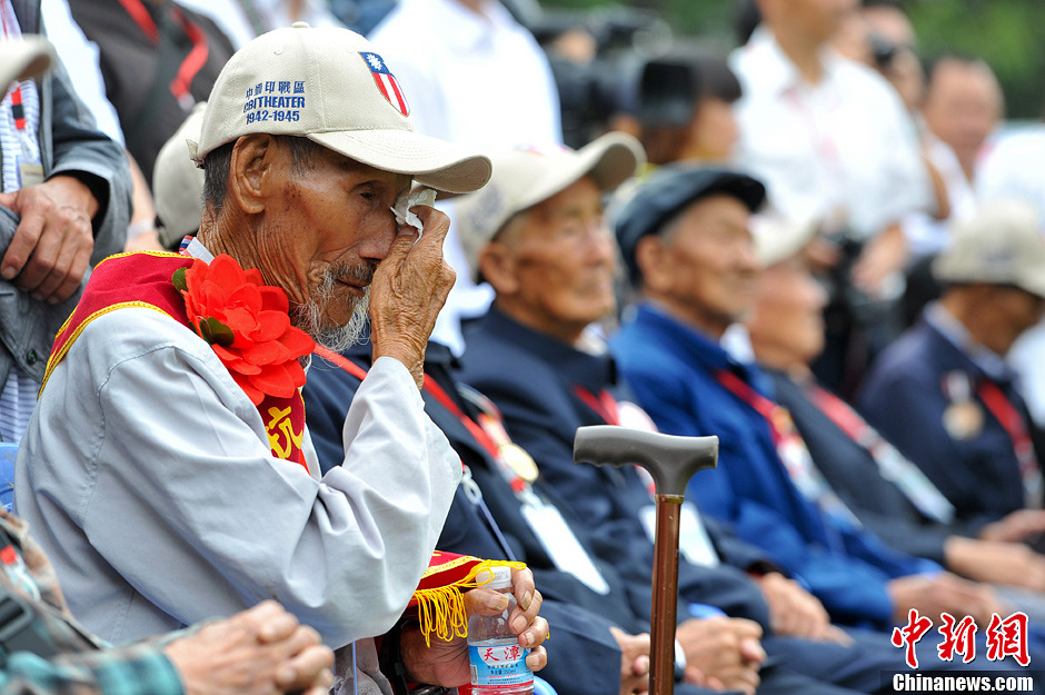 9月3日,正值世界反法西斯战争胜利68周年之日,中国远征军雕塑群在云南龙陵县松山战役旧址落成,12位中国远征军老兵和部分远征军将士后人走进松山,重拾历史记忆,缅怀抗战英烈。据了解,由雕塑家李春华创作并捐赠的402座单体雕塑是用东方造像方式,按真人尺度1:1.2的比例塑造。图为老兵在落成仪式现场擦眼泪。中新社发任东摄
