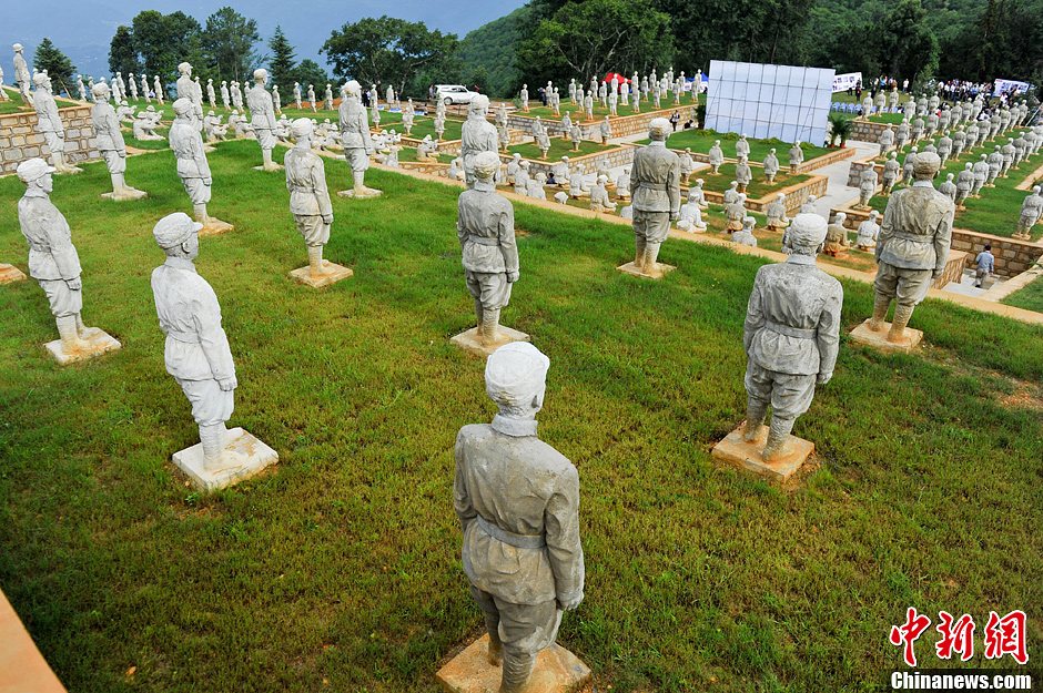 9月3日,正值世界反法西斯战争胜利68周年之日,中国远征军雕塑群在云南龙陵县松山战役旧址落成,12位中国远征军老兵和部分远征军将士后人走进松山,重拾历史记忆,缅怀抗战英烈。据了解,由雕塑家李春华创作并捐赠的402座单体雕塑是用东方造像方式,按真人尺度1:1.2的比例塑造。中新社发任东摄