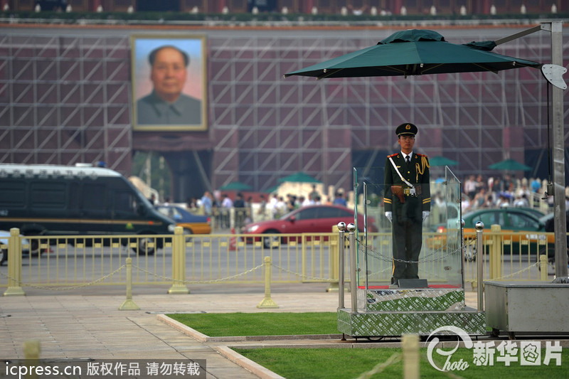 2013年9月4日,北京天安门城楼开始日常修缮,城楼的下半部分已被红色围挡遮住,但在天安门城楼附近游览的游客仍兴致不减。据悉,天安门城楼每年国庆前会进行一次外墙粉刷、修缮,并于国庆节前完工,修缮期间正常迎接游客参观。