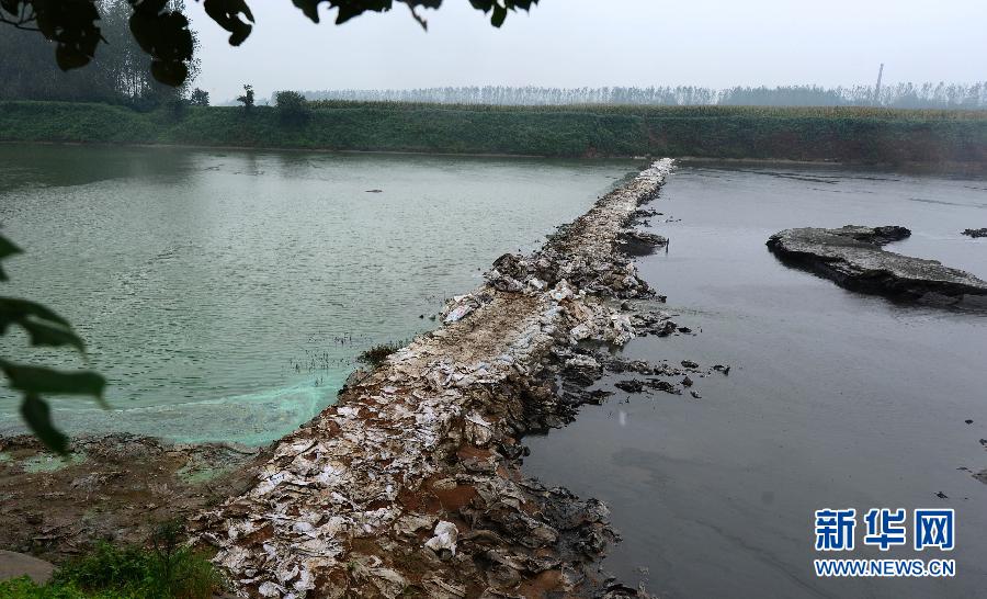 一道堤上下游的水质对比,左边是府河上游水质较好,右边是湖北双环科技公司排污口所在的地方,河水漆黑(9月4日摄)。