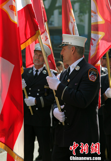 当地时间9月11日是9·11恐怖袭击事件12周年,部分纽约消防员到纽约世贸中心遗址,纪念9·11恐怖袭击事件12周年。在2001年9·11恐怖袭击事件中,纽约共有343名消防员在救援中遇难。中新社发阮煜琳摄