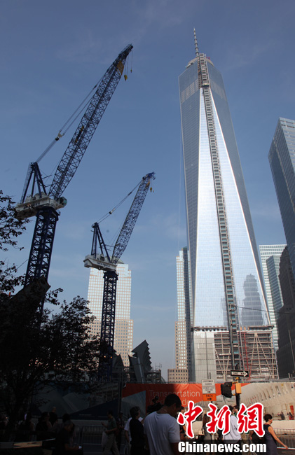 9月11日,9·11恐怖袭击事件12周年,纽约大批民众来到世贸遗址纪念遇难者。图为在被9·11恐怖袭击事件摧毁的世贸双子塔北侧,重建的纽约世界贸易中心一号楼即将完工,预计到2013年底竣工时,该楼楼体加楼顶天线的高度将达1776英尺(约合541.3米),成为西半球最高楼、世界第三高楼。中新社发阮煜琳摄