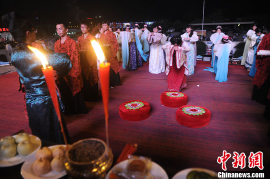 中秋节将至,9月17日晚,汉服爱好者在重庆洋人街景区演示古人祭拜中秋圆月的仪式。陈超摄