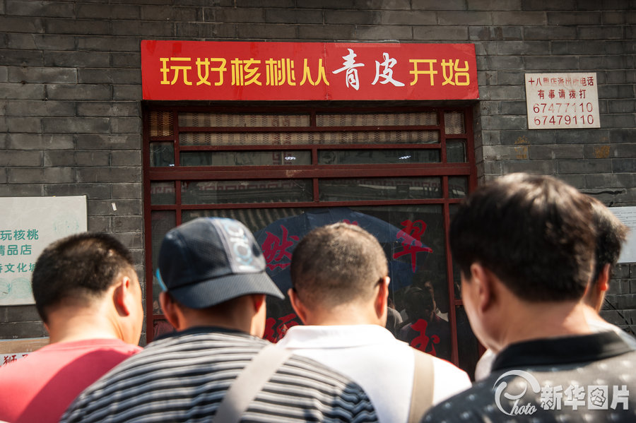 “核桃杨”叫杨洋,5年前因首创赌青皮而声名鹊起。今年26岁,却有13年买卖核桃的历史。记者看到,二三十人围成一个半圆,圈内的人坐在马扎上,圈外的人则伸长脖子,观看“核桃杨”的现场表演。据了解,这家地摊的价位,是文化城里赌青皮中价位最高的。其身后的砖墙上有一行字:玩好核桃从赌青皮开始。