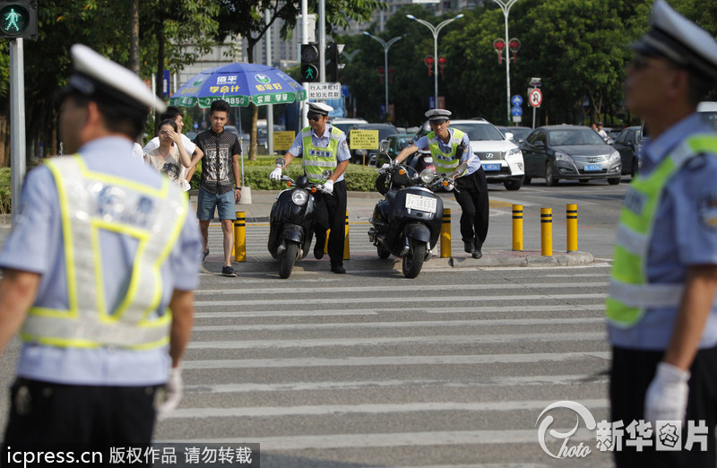 2013年10月8日下午,广东惠州,交警在全市对行人闯红绿灯、电动车和非机动车的不遵章行驶进行严管,江北街头违章车主被当场处罚。