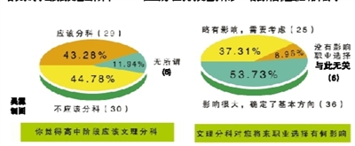 对于目前高中实行的文理分科,大半的受访者认为能够减小学习压力。在知识的掌握上,持“分科学不到大学时所需的综合知识”和“分科可以学得更专业”意见的人数基本持平。