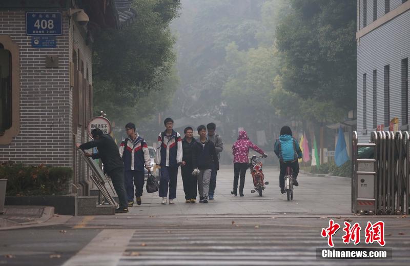 2013年12月5日,南京出现重度雾霾天气,全市中小学、幼儿园全面停课。南京市教育局要求,全市中小学幼儿园停课期间,教师正常到校,家中无人照顾的学生可以送到学校。对因未及时接到停课通知而到校的学生,学校会按照要求做好看护工作,并将开放图书馆、体育馆、科技室等室内活动场所供到校学生活动,但不得授课。加强对住校学生的看护,采取一切必要的防护措施。对停课给学生们造成的课程延误,学校将会在后面的教学中予以安排。南京市教育局表示,在污染天气红色预警解除通告后,学校将及时发布通知,恢复正常教学秩序。图为一些学生正在从南京市第十二中学初中部走出。图片来源:东方IC版权作品请勿转载