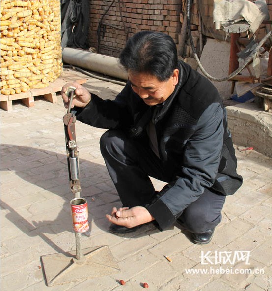 朱占福演示自己制造的大枣去核机。长城网 刘振山 摄