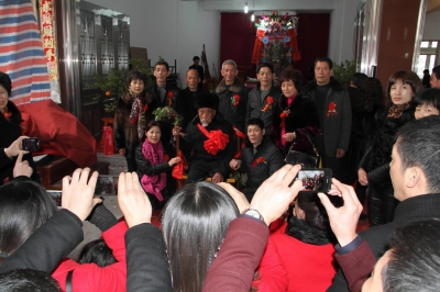 老人虽然年事已高,但身体还很硬朗,头脑清醒,每天能吃一斤饭,能吃糖糕,能嚼豌豆。今年是老人百岁寿辰。正月初六,作为四甲社区孔氏德高望重的族长,孔氏后人数百人为其举行百岁寿辰庆祝巡游活动,男女老少全体出动,去给“老寿星”拜年,巡游活动中,平时久违的温州永强地方传统的寿桃、“方盛”、“六格”等民俗用具引得路人纷纷驻足观看。