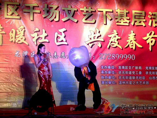 龙湾新闻网讯 日前,龙湾区千场文艺下基层活动之“情暖社区、共度春节”文艺汇演在状元街道新元社区山西岙村热闹开演,龙湾区文广新局邀请温州星之光歌舞团的演职人员为当地居民送上了一场别开生面的“文化大戏”。