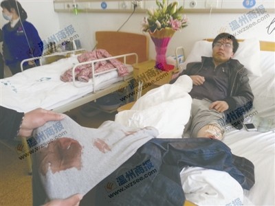 昨天下午,温州市公安局局长黄宝坤在得知此事后第一时间作出指示,委派乐清市公安局党委书记蒋荣国前往慰问了徐志博。记者在病房看到,当时徐志博所穿的4条裤子(棉毛裤、羊毛裤、牛仔裤、工作服)都被匕首扎破被鲜血染红。