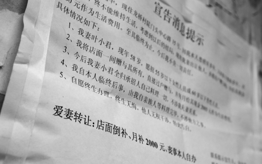 “因我本人患癌症,又因妻子患病多年。在这打击下,终不能维持生活。考虑到以后的结局,现将我妻出让他人,并将房产赠予他,并给其现金2000元(每月)作为生活费用。至其(妻子)临终为止。”永嘉县江北街道塘头村芦桥中祥路一公告栏上,这张告示引来不少人围观。