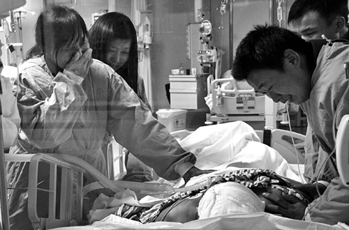 昨天下午,温医大附一院重症监护室,宋庆强的妻子、儿子、女儿等亲属与他泪别。