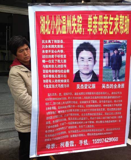 但没想到的是,从去年2月份开始,吴杰便不再给家里打电话了。刚开始柯春霞以为儿子工作太忙才没时间和她联系,可过了一段时间还是没有来电,而且她给儿子打电话时怎么也联系不上,于是她开始着急起来,联系了在温的老乡,大家都称没见过吴杰,这时她才意识到问题变得严重。
