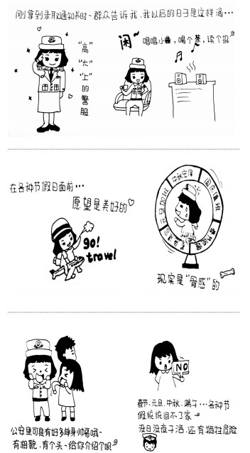 同事的提议,朱雪娜决定试一试。本月22日是周六,趁着休息时间,她终于完成了第一幅萌女警卡通画。第二天,以女警形象为主角的漫画组图就出炉了——就是昨天网上热传的最萌手绘漫画。