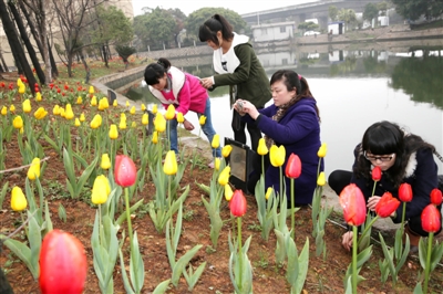 3月1日,市民在河泥荡公园郁金香主题园观赏郁金香。据悉,去年11月,为了让市民在春天赏花提供一个好去处,也为公园局部景观彩化、绿化提升和创建星级公园夯实基础,区城管执法局首次组织人员精心栽培了六七个品种8000株郁金香,春节开花,花期将持续到3月底。下阶段,该公园还将开辟荷花池等新景观,根据季节的变化,在局部的节点开展彩化工作,提升公园的文化品位。