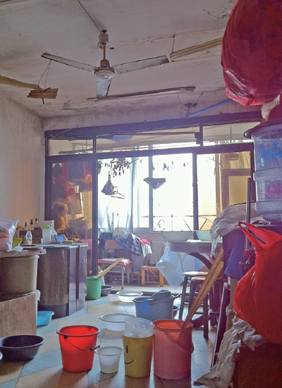 两年来,每次大雨过后,梅老伯家的厨房总是一片狼藉。由于积水过多,梅老伯的老伴只好穿着雨鞋进厨房做饭。她说:“我们年纪大了,行动不方便,生怕滑倒摔着,这种苦日子不知道什么时候才能结束。”