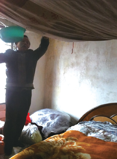 在卧室的床铺上方,盖着一张塑料薄膜,薄膜上面还放了一个脸盆。梅老伯说,每次下雨都要伴着“滴答”声入睡,半夜还要起床倒掉脸盆里的积水,要不然水积太满了会戳破薄膜。