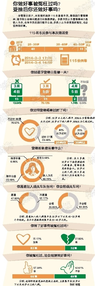 今天是毛泽东题词“向雷锋同志学习”第51个纪念日,每年这个时候,都会涌现出大批学雷锋志愿者走上街头做善事。短暂的喧嚣之后,很快归于平静。今天我们该如何传承雷锋精神?平日里我们如何做好事?学雷锋是否已经过时了……对这些问题,温州市民心中的答案到底是什么?记者选取市民最常见的街头公益“爱心顺风车”进行采访体验,并于昨前两天开展问卷调查。大部分市民对践行雷锋精神,参与公益表示乐意,但记者体验发现,仅“爱心顺风车”这种随手公益,想做好却并不那么容易。