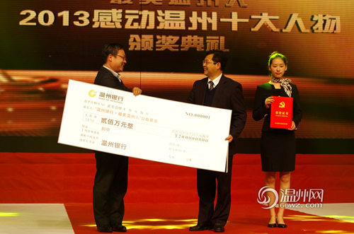 “最美温州人”公益基金在颁奖典礼上同步启动。温州银行董事长邢增福表示,温州银行将出资200万元作为基金发起资金,对接下来被授予“最美温州人”称号的感动人物及模范人物酌情给予2—10万元奖励,并为相关事宜提供经费支持,以鼓励先进,向社会传递正能量。该笔资金将由温州市委宣传部和温州银行共同管理,实行财务公开。