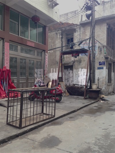 昨天下午4时许,记者来到龙湾区沙城街道七三村调查。该非法屠宰点位于七三村益三路内,周边楼密巷窄。但沿着益三路直走2分钟左右,一个高约2米的铁架子就出现在了路边空地上。王先生告诉记者,铁架后的房子就是经营者的家,他家屋后有一个棚子,用来屠宰生猪,每天刚被宰杀好的生猪肉都会被挂在铁架上。记者发现,架上的铁钩已经锈迹斑斑,靠近铁架旁的部分石墙已被沾染成了红褐色,边上一个下水管道入口还有残存的猪毛。