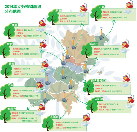 今年市林业局在全市范围内开辟了11个义务植树点(具体地点可参照下面的植树地图),3月8日至16日,各地绿化委员会按属地组织开展本辖区内的全民义务植树活动,各义务植树基地的牵头单位负责组织全市100多个单位定期分批次前往开展义务植树。有意愿参与的市民可以事先联系基地联系人,安排好时间之后,自带植树工具前往参与植树,树苗由各个基地免费提供。11个植树点总共可容纳2万人植树,市、县(市、区)林业部门今年已准备了约6万株苗免费供市民植树。同时,市绿化委鼓励和提倡各地以捐(送)苗植绿、认种认养、结对绿化、网上植树等多形式履行法定植树义务。