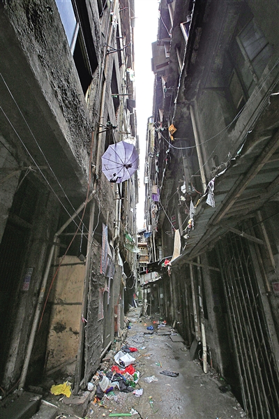 中央涂永发巷,是典型的“一线天”,房前屋后门挨着门、窗贴着窗,两幢楼房的间隔不足3米。87岁的唐宝林,就住在巷子里,每每回家,头上是蛛网般密布的电线,脚下是泥泞污水,一旁的垃圾堆,散发着一股股恶臭。