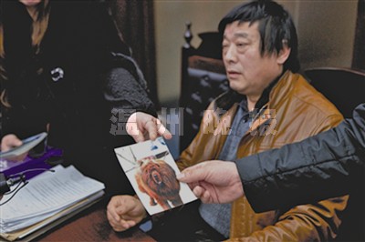 狗主人出示藏獒照片。昨日,藏獒美容致死索赔案二审开庭。