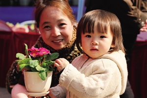 在昨天举行的“以物换绿”活动现场,一位小女孩用旧物换回了一盆刚开花的植物。陈超摄