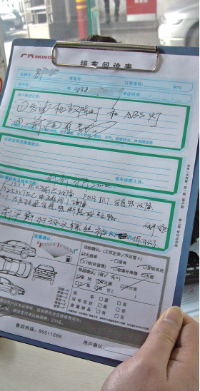 半小时后,工作人员拿出一份“接车问诊表”,上面列明数项故障:点火输出故障,传感器故障,左后轮速传感器断路或短路;左前平衡杆球头螺丝拆松等。