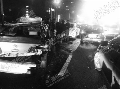 仔细一看,出租车已经从三厢变成了两厢。车祸还导致出租车与前方的甲壳虫轿车和广本轿车发生连环追尾。