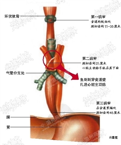 “第一、第二狭窄处相距4-7厘米,但卡在第二狭窄处则危机重重。”他称,人体内最靠近心脏、内径最粗、压力最高的血管,就是主动脉(弓),它紧贴食道第二狭窄处,鱼刺穿破食道壁、扎进主动脉,早期表现为食道疼痛,数日后伤口炎症加重,最终导致主动脉破裂,“主动脉破裂,后果就不堪设想了”。