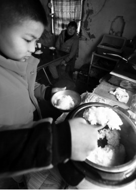 林杰的午饭是在学校吃的。妈妈的午饭由住在不远处的奶奶做好送过去。到了晚上,奶奶会把做好的菜送到林杰家。林杰放学回家后,将奶奶送来的菜热好,煮好饭,照顾妈妈吃掉后,赶紧把锅碗洗好,再从不远处拎好第二天要用的山泉水。做完这些,他就抓紧时间做在学校没做完的作业,还要给妈妈洗脸、洗脚、按摩手脚,清理妈妈的大小便,再把妈妈扶到床上睡觉,自己有空就看一会儿电视,时间晚了就上床睡觉。
