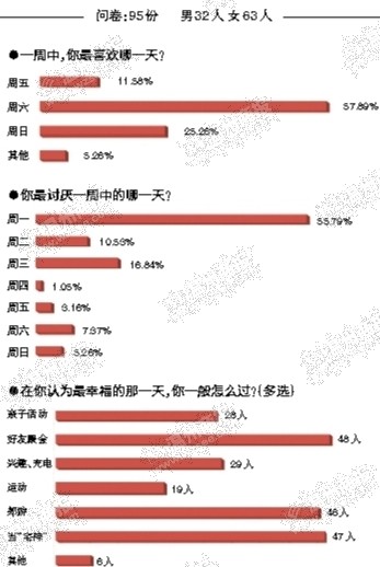 日前,清华大学的科研团队所做的一项研究表明,星期六是国人一周中最快乐的一天。昨前两天,记者就此开展了微调查:一周,你最喜欢哪一天?在95个调查样本中,“洒脱日”(Saturday)周六众望所归,荣登榜首,而周一受交通拥堵、每周例会、工作量大等因素拖累,无辜垫底。