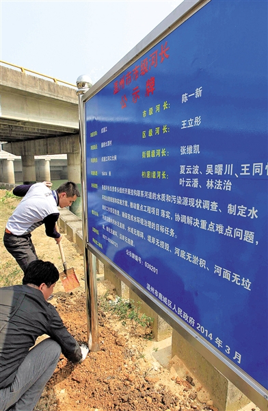 昨天,鹿城区藤桥镇戍浦江主要水系处的岸边竖起了两块“河长公示牌”,上面写着“市级河长:陈一新;区级河长:王立彤;街镇级河长:张维凯;村(居)级河长:夏云波、王同快、吴曙川、叶云潘、林法治”。到本月底,我市的县级以上河道,都将竖起河长公示牌,便于市民参与监督。