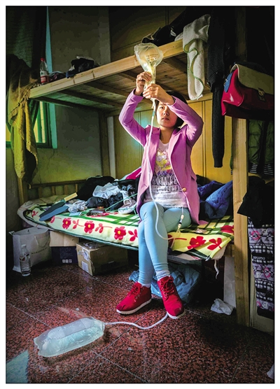 采访快结束时,月静要给自己做当天的第2次透析。一包2公斤重的透析液通过管子一点点流入她的体内,置换出肾脏无法处理的液体。在这并不愉快的半小时中,月静一直对记者笑着,聊着自己的爱好,憧憬着将来有钱了能去台湾看看,吃遍那里的美食。