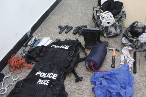 3月7日晚7时许,蒲州派出所副所长卢雷雷带队对辖区重点区域开展巡逻排查时,在紧固件市场旁一修车厂门口发现一辆可疑七座面包车。该车一直停放在路边,车上有人在活动,行迹极为可疑。民警立即对该车进行包围搜查,发现车内有胶带纸,饮料瓶,警棍,头盔,协警服,防真枪、头套、口罩等装备,在对车上人员进行盘查时,车上人员神态极为紧张,遂被带回派出所进一步检查。